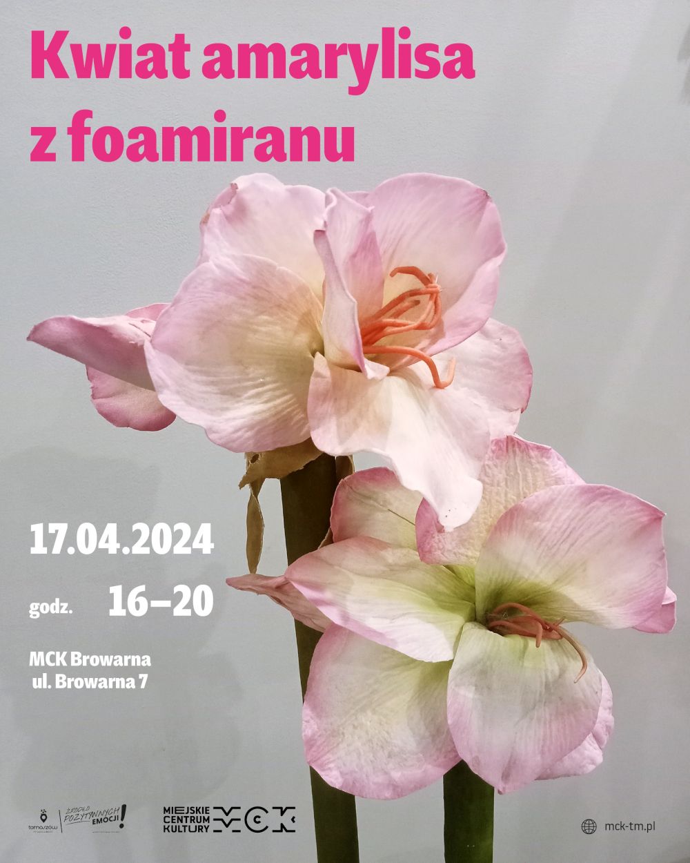 Miejskie Centrum Kultury wszystkich chętnych zaprasza do rozwijania zdolności manualnych na warsztatach pn. "Kwiat amarylisa z foamiranu". Choć nazwa wydaje się skomplikowana, efekt będzie wyjątkowy. Wydarzenie odbędzie się 17 kwietnia w godz. 16-20 w MCK Browarna, przy ul. Browarnej 7. Obowiązują zapisy.