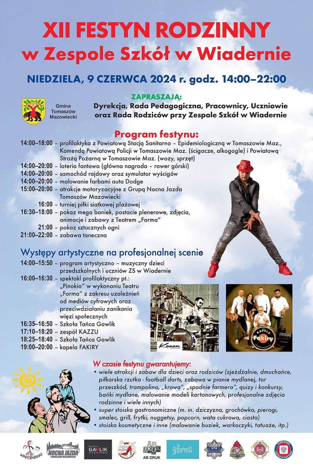 W czasie festynu od godz. 14.00 swoje talenty artystyczne będą prezentować dzieci z ZS w Wiadernie. O godz. 16.00 rozpocznie się też spektakl profilaktyczny pt. "Pinokio" w wykonaniu Teatru "Forma" z zakresu uzależnień od mediów cyfrowych oraz przeciwdziałaniu zanikania więzi społecznych. Można będzie się pobawić ze Szkołą Tańca Gawlik. O godz. 17.10 wystąpi zespół Kazzu, a o godz. 19.00 kapela Fakiry. – W czasie festynu gwarantujemy zjeżdżalnie, dmuchańce, football darts, tor przeszkód, trampolinę, quizy, konkursy, bańki mydlane i inne atrakcje dla dzieci – mówi A. Świech. Będą też stoiska gastronomiczne ze smakołykami i stoiska kosmetyczne.