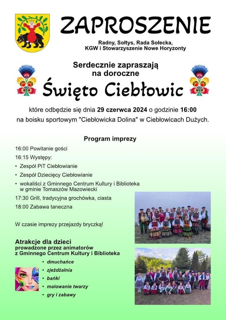 Nie zabraknie atrakcji dla dzieci, w tym animacji, zjeżdżalni, dmuchanego zamku etc. Na święto wsi zapraszają sołtys, Rada Sołecka, radny z Ciebłowic, KGW i Stowarzyszenie Nowe Horyzonty.