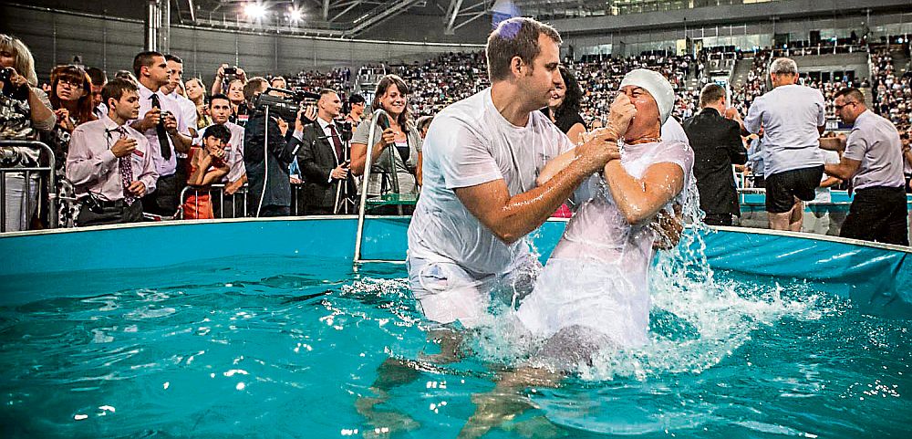 Ważny punkt zgromadzenia w Atlas Arenie stanowił publiczny chrzest, który w sobotę przyjęło 37 osób, zanurzanych w basenie pełnym wody.