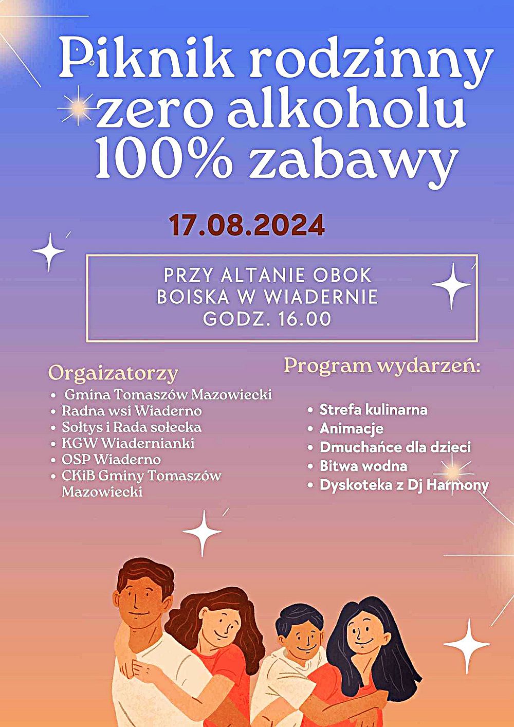 W sobotę, 17 sierpnia o godz. 16.00 przy altanie obok boiska w Wiadernie odbędzie się piknik rodzinny bez alkoholu.