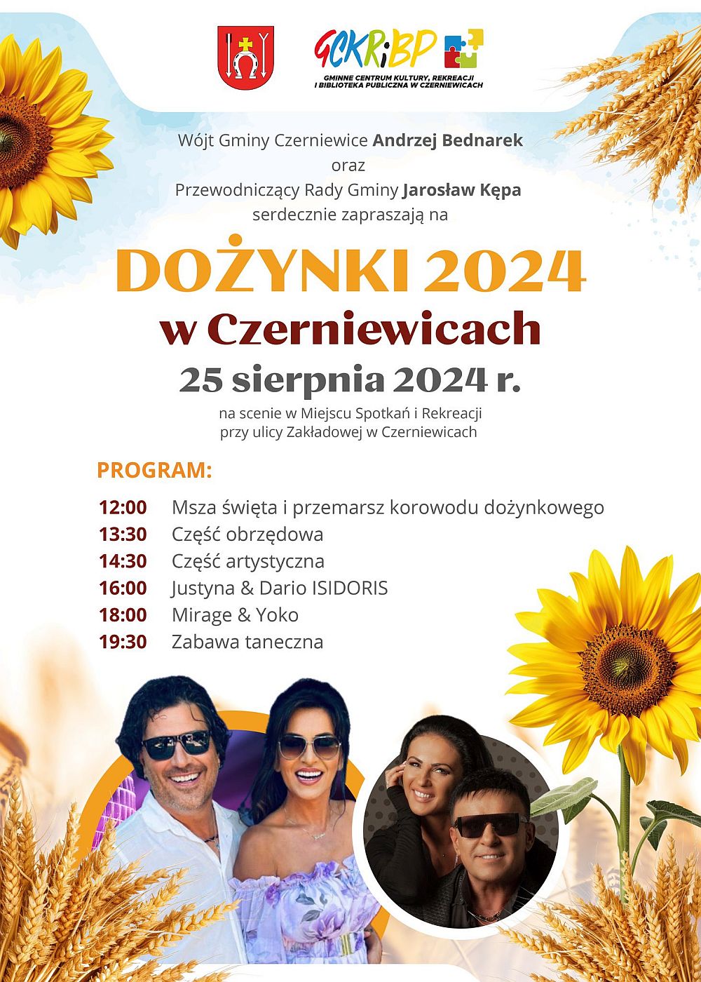 Bochen chleba upieczonego z mąki pochodzącej z ostatnich zbiorów gospodarzom czerniewickiego święta plonów starostowie wręczą 25 sierpnia. Obchody rozpocznie w południe okolicznościowa msza, po której korowód dożynkowy przemaszeruje do Miejsca Spotkań i Rekreacji w Czerniewicach (zlokalizowanego przy ul. Zakładowej). Tam o godzinie 13.30 rozpocznie się część obrzędowa z udziałem zespołu ludowego "Czerniewiczanie". Od 14.30 zaplanowana jest część artystyczna, w tym koncerty polsko-włoskiego duetu Justyna & Dario ISIDORIS (16.00) oraz Mirage & Yoko (18.00). Na zakończenie, od 19.30, przewidziana jest zabawa taneczna. By nie zabrakło na nią sił, będzie poczęstunek w postaci potraw "z wiejskiego stołu" oraz – tradycyjnie już – grochówki.