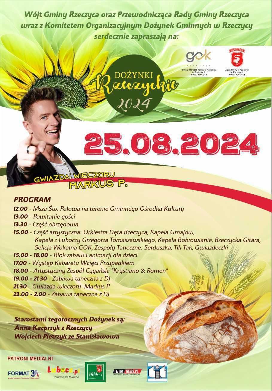 Do występów w części artystycznej (od 15.00) szykują się: Orkiestra Dęta z Rzeczycy, Kapela Gmajów, Kapela z Luboczy Grzegorza Tomaszewskiego, Kapela Bobrowianie, Rzeczycka Gitara, sekcja wokalna GOK oraz zespoły taneczne: Serduszka, Tik Tak i Gwiazdeczki. Na scenie gościć będą również: Kabaret Wcięci Przypadkiem (17.00), Artystyczny Zespół Cygański "Krystiano & Romen" (18.00) oraz, jako gwiazda wieczoru, Markus P. (21.30). Jego koncert przedzieli zaplanowaną w godzinach od 19.00 do 21.30 i od 23.00 do 2.00 zabawę taneczną z didżejem.