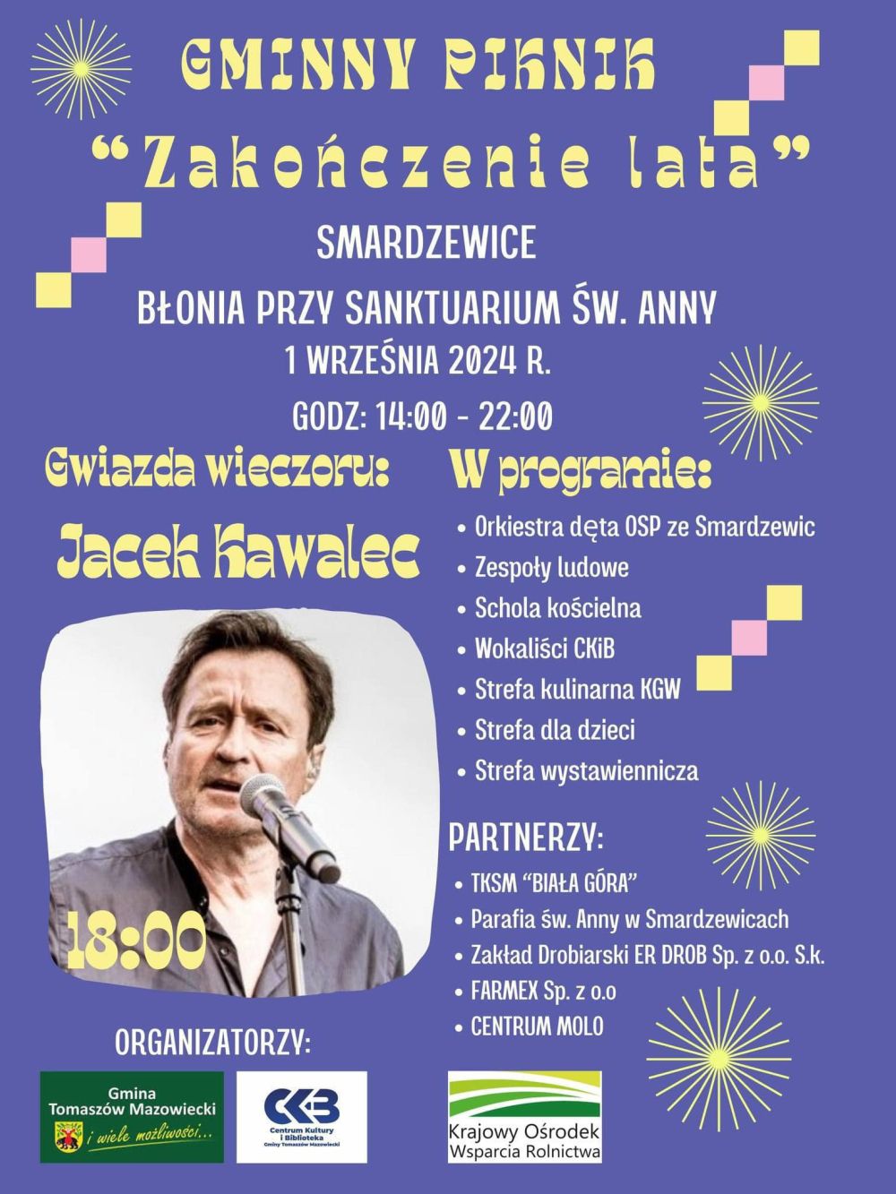 W programie przewidziane są występy: orkiestry dętej Ochotniczej Straży Pożarnej ze Smardzewic, zespołów ludowych, kościelnej scholi oraz wokalistów CKiB, a także koncert Jacka Kawalca z zespołem jako gwiazdy wieczoru (18.00). Na terenie imprezy przygotowane zostaną również strefy tematyczne: dla dzieci, kulinarna (ze smakołykami autorstwa działających na terenie gminy kół gospodyń wiejskich) i wystawiennicza.