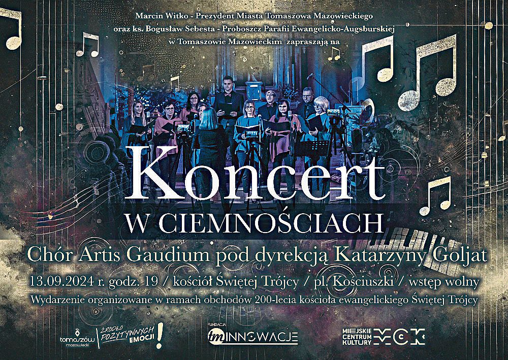 Koncert w ciemnościach to ciekawa propozycja, dzięki której w wydarzenie i jego odbiór można będzie zaangażować wszystkie zmysły, niezmącone światłem i obrazami przed oczyma. To wyzwanie podejmie miejski chór Artis Gaudium pod dyrekcją Katarzyny Goljat, w którym śpiewa około 30 osób. Zaplanowano różnorodny repertuar od utworów klasycznych przez gospel, jazz aż do światowych przebojów muzyki rozrywkowej. Wydarzenie organizuje Parafia Ewangelicko-Augsburska w Tomaszowie, Urząd Miasta, Miejskie Centrum Kultury oraz Fundacja TM Innowacje. Wstęp wolny.