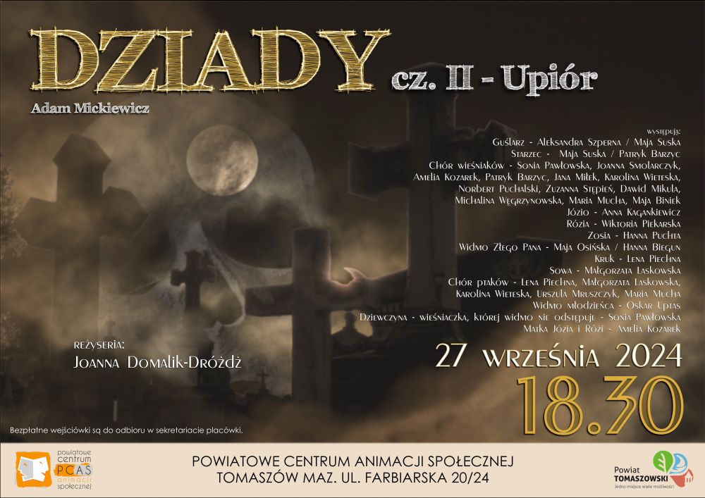 Zaprezentują spektakl według scenariusza i w reżyserii Joanny Domagalik-Dróżdż, instruktorki placówki oraz nauczycielki języka polskiego i opiekunki Grupy Teatralnej "Inni" w Szkole Podstawowej nr 9. Przedstawienie zaplanowane jest na kolejny piątek, 27 września na godzinę 18.30. Wstęp jest wolny, ale wymaga okazania bezpłatnej wejściówki. Już teraz można je odbierać w sekretariacie PCAS przy ul. Farbiarskiej 20/24. (Fot. plakat wydarzenia)