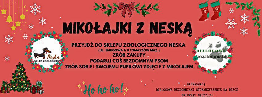 Chociaż tak ściślej, to one mogą się do niego przespacerować wraz z właścicielami, odwiedzając w sobotę, 7 grudnia sklep zoologiczno-wędkarski NESKA przy ul. Smugowej 1/11. Tam w godzinach od 10.00 do 14.00 na czworonogi czekać będą upominki, na dwunożnych natomiast: możliwość zrobienia wspólnego z pupilem świątecznego zdjęcia, porady behawiorysty i trenera, pomoc w doborze sprzętów i akcesoriów dla zwierzaków, zaś dla najmłodszych przewidziane są (oczywiście, zmywalne) tatuaże.