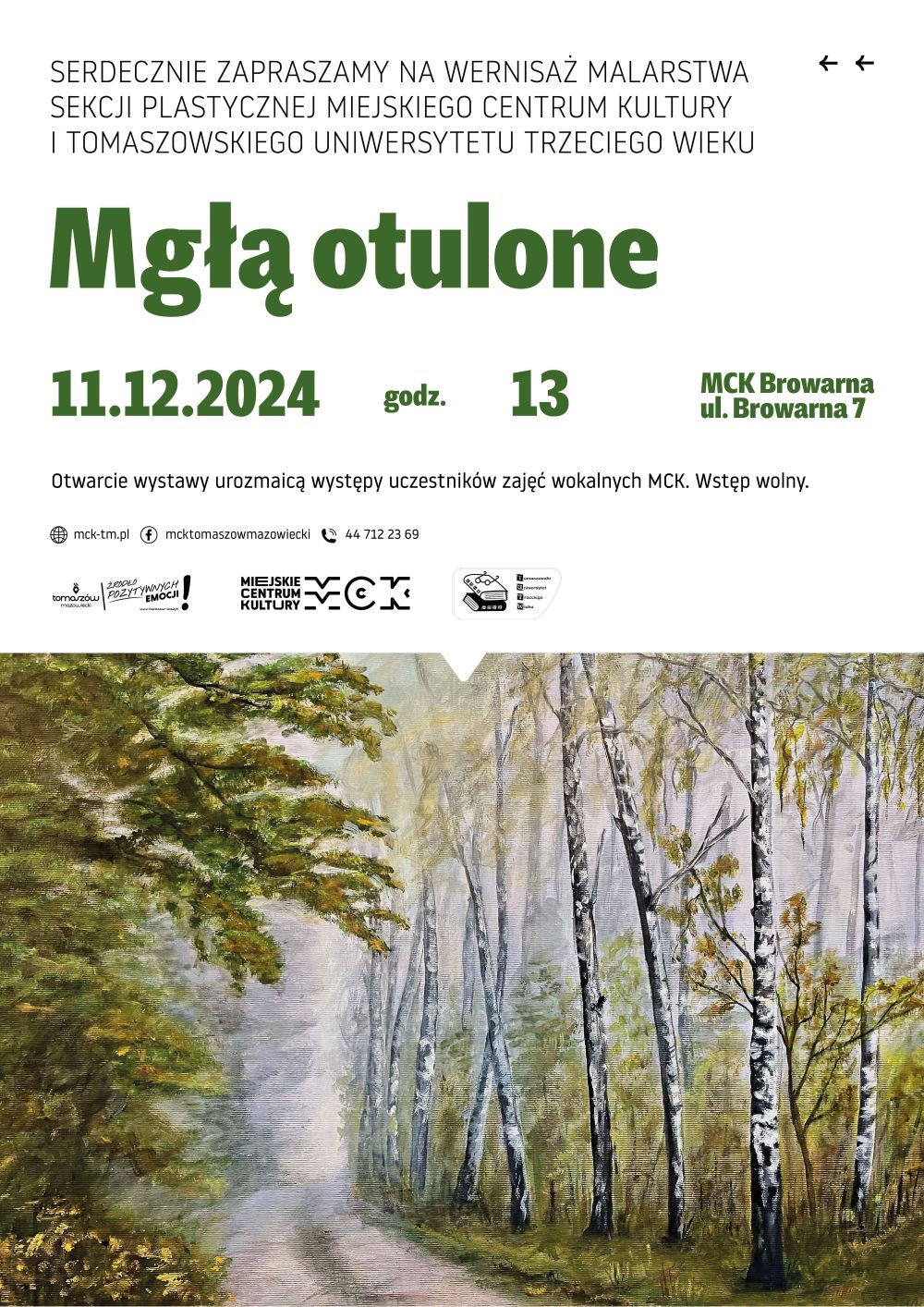 Działająca pod kierunkiem Bożeny Gajdy sekcja plastyczna MCK/TUTW od siedemnastu lat skupia osoby dorosłe, realizujące swoje pasje związane z różnymi technikami malarskimi. Powstałe prace, o różnorodnej tematyce, prezentuje na cyklicznych wystawach na terenie całego miasta i poza jego granicami. Tym razem, na kolejnej już ekspozycji w Miejskim Centrum Kultury – filii Browarna (ul. Browarna 7), zatytułowanej "Mgłą otulone", pokazane zostaną pejzaże oraz, mówiąc najogólniej, inspiracje jesienną aurą i naturą.
