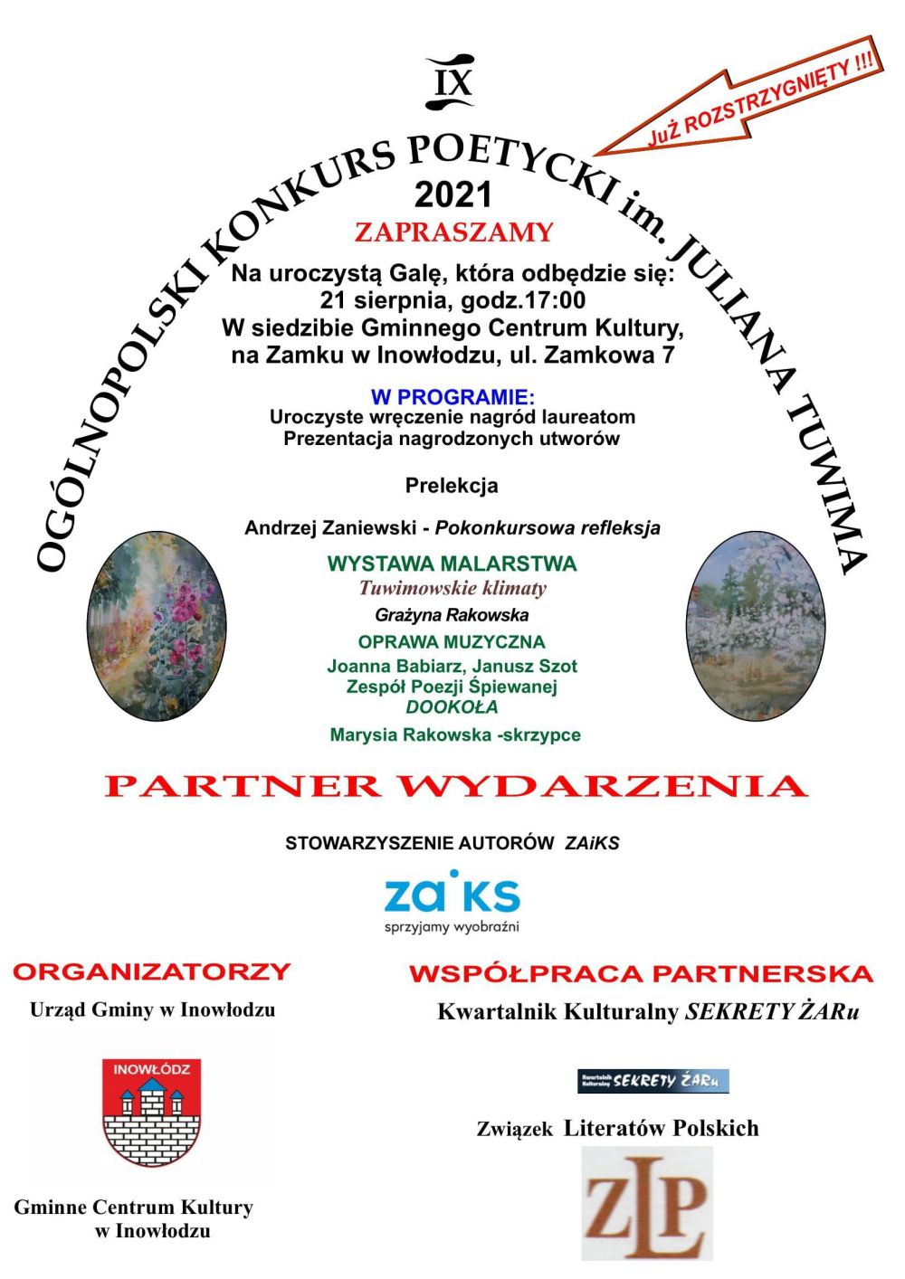 21 sierpnia o godz. 17.00 na zamku w Inowłodzu odbędzie się gala podsumowująca Ogólnopolski Konkurs Poetycki im. Juliana Tuwima.