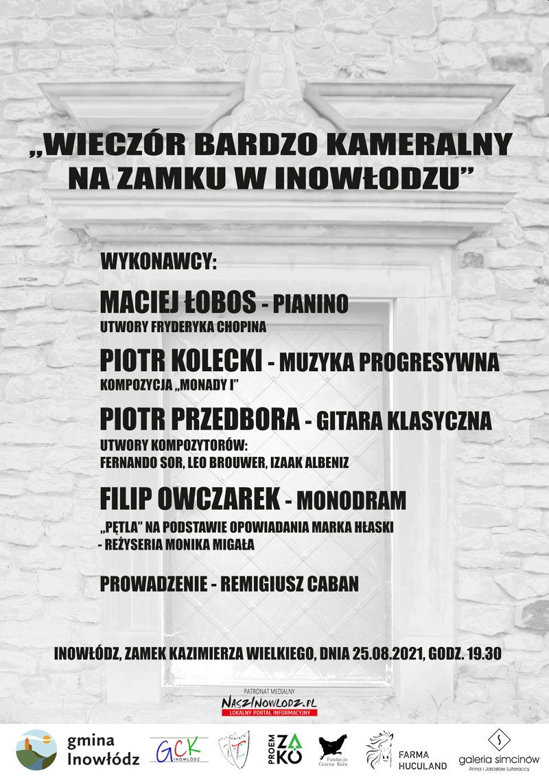25 sierpnia o godz. 19.30 odbędzie się wydarzenie plenerowe pn. "Wieczór bardzo kameralny na zamku w Inowłodzu". Pomysłodawcą i organizatorem wydarzenia jest Marek Leszczyński, współtwórca interdyscyplinarnego festiwalu Muzyka w Krajobrazie w Inowłodzu przekształconego w Festiwal w Krajobrazie.