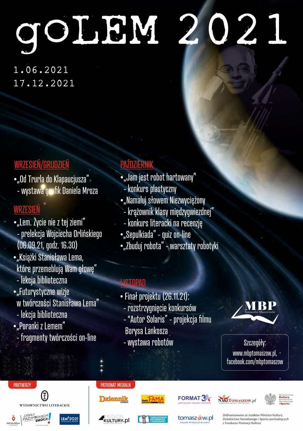 We wrześniu odbędą się także: cykl lekcji bibliotecznych skierowanych do dzieci i młodzieży przybliżających sylwetkę i twórczość Stanisława Lema, a także "Poranki z Lemem" - cykl internetowych publikacji wybranych fragmentów książek pisarza. Na październik br. zaplanowano warsztaty robotyki "Zbuduj robota". W ramach "goLEM 2021" odbędą się również trzy konkursy skierowane do różnych grup odbiorców. Konkurs plastyczny dla dzieci "Jam jest robot hartowany", literacki na recenzję dowolnej książki Stanisława Lema "Namaluj słowem Niezwyciężony – krążownik klasy międzygwiezdnej" skierowany do młodzieży, jak również Quiz on-line "Sepulkiada". Podsumowanie akcji odbędzie się 26 listopada. Uroczystości będą towarzyszyć: projekcja filmu Borysa Lankosza "Autor Solaris" oraz wystawa robotów.