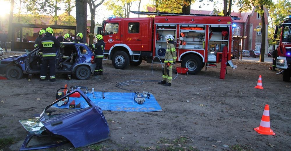 Zainscenizowano także zdarzenie drogowe. Kierowca samochodu osobowego z nieznanych przyczyn nie ustąpił pierwszeństwa przejazdu i zderzył się z drugim, prawidłowo jadącym, pojazdem. Strażacy (z OSP z Inowłodza, Brzustowa i Królowej Woli) cięli karoserię pojazdów, żeby uwolnić poszkodowanych. Jednostka z Liciążnej zabezpieczała teren.