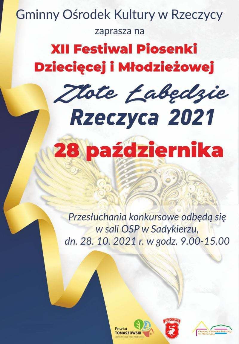 Przesłuchania do XII Festiwalu Piosenki Dziecięcej i Młodzieżowej "Złote łabędzie" Rzeczyca 2021 odbędą się czwartek, 28 października w godzinach 9-15 w sali OSP w Sadykierzu.