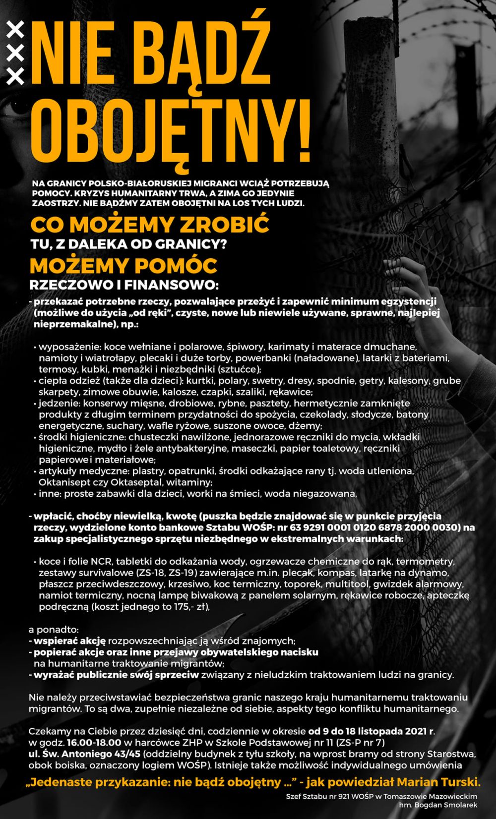 W mediach społecznościowych pojawiło się wiele negatywnych komentarzy. - Ten wszechobecny hejt spowodowany jest tym, że ludzie przestali rozgraniczać obronę polskiej granicy od pomocy ludziom takiej pomocy potrzebującym - mówi B. Smolarek. Szef sztabu WOŚP informuje, że czwartek (18 listopada) jest ostatnim dniem zbiórki. Każdy kto chce do niej dołączyć może to zrobić w godz. 16.00-18.00 w Szkole Podstawowej nr 11.