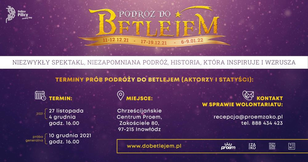 Ta ostatnia, generalna, w strojach obędzie się w najbliższy piątek, 10 grudnia. Natomiast w sobotę i niedzielę (11 i 12 grudnia) w godz. od 16.00 do 19.00 wystawiane będą już pierwsze spektakle dla publiczności. Kolejne odsłony "Podróży do Betlejem" będzie można zobaczyć od 17 do 19 grudnia oraz od 6 do 9 stycznia (od 16.00 do 19.00). - Scenariusz widowiska jak co roku jest oparty na przekazach z ewangelii. Historii nie zmienimy. Pokazujemy wydarzenia, które poprzedziły narodzenie Jezusa Chrystusa. Wstęp dla wszystkich jest wolny. Parkingi też będą bezpłatne. Poza częścią koncertową wszystkie sceny przedstawienia będą prezentowane na zewnątrz. Poszczególne grupy widzów, które będą się wcielać w plemiona żydowskie, ze względu na obostrzenia pandemiczne będą mniejsze niż były w poprzednich latach. Tak więc każdy będzie miał komfort dystansu i bezpieczeństwa - zapewnia E. Wawrzyniak.