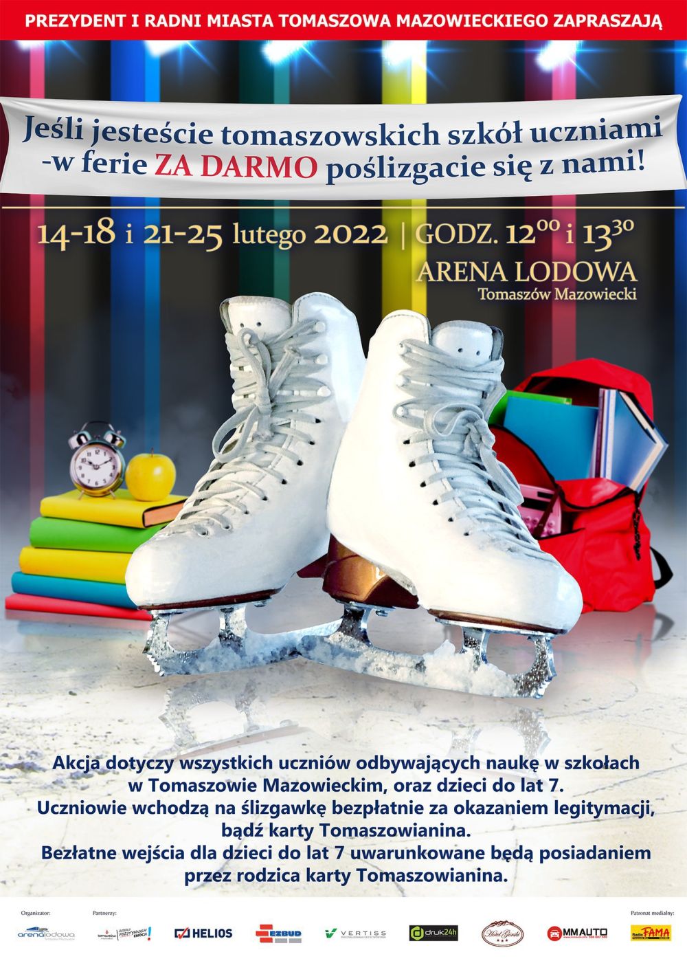 Odbędą się one w dniach 14-18 i 21-25 lutego br. od godziny 12 do 13 oraz od 13.30 do 14.30. Należy jedynie okazać legitymację szkolną bądź Kartę Tomaszowianina (dzieci do 7. roku życia również wejdą na lód po okazaniu przez rodzica karty).