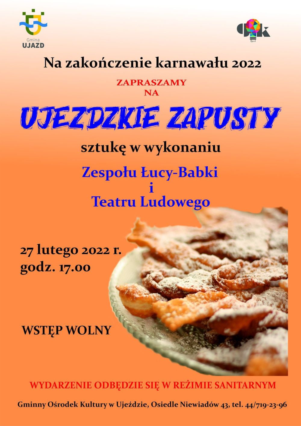 Pokazane będą nie tylko ostatnie dni dawnego karnawału, ale cały okres zabaw trwający w Polsce od 6 stycznia do ostatniego wtorku karnawału. - Przeniesiemy się do czasów sprzed 100 lat, do ok. 1920 r. Sztuka zaprezentuje dawne obrzędy i zwyczaje, to jak obchodzono zapusty w okolicach Ujazdu - mówi Michał Adam Pająk, dyrektor GOK w Ujeździe. Zobaczyć będzie można, jak wyglądał dawniej np. tłusty czwartek, kiedy to świętowały głównie panie. Można powiedzieć, że było to święto analogiczne do dzisiejszego Dnia Kobiet. Na scenie swoje umiejętności i talent pokażą członkowie zespołu Łucy Babki i Teatru Ludowego, do którego należą mieszkańcy gminy Ujazd. Zagra też kapela Romana Wojciechowskiego. Wstęp wolny.