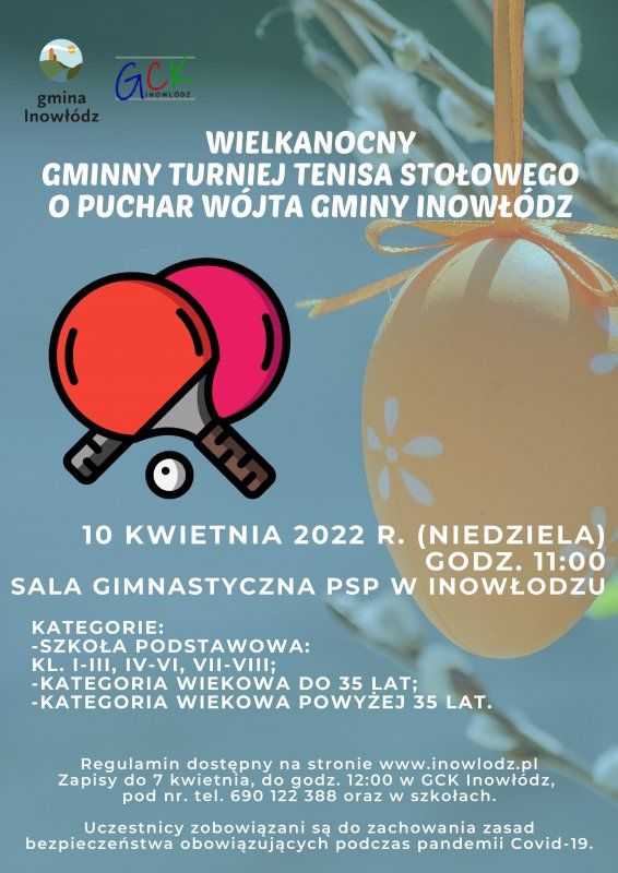 W niedzielę, 10 kwietnia o godz. 11.00 w sali gimnastycznej szkoły w Inowłodzu odbędzie się wielkanocny turniej tenisa stołowego.