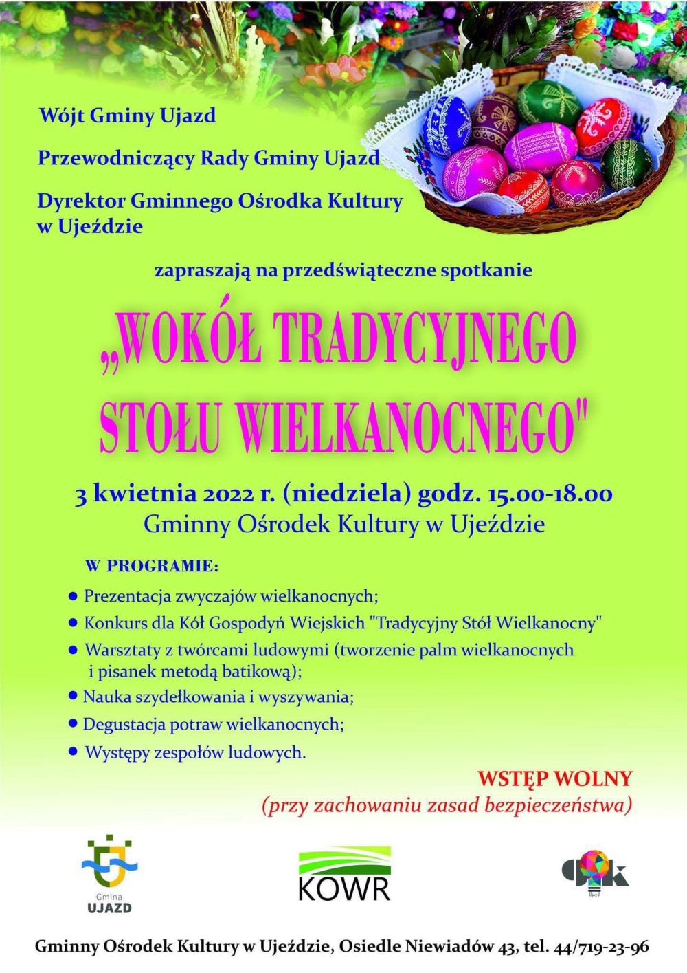 Wokół tradycyjnego stołu wielkanocnego to tytuł przedświątecznego spotkania, które odbędzie się w niedzielę, 3 kwietnia w godz. 15-18 w Gminnym Ośrodku Kultury w Ujeździe.