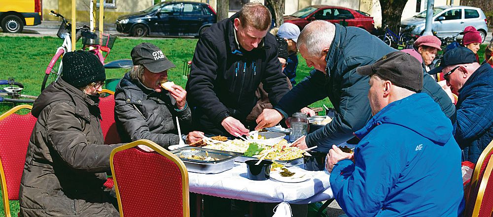 W parku ustawiono stoły przykryte białymi obrusami i ławki dla gości. - Jeszcze rano tak wiało i było tak zimno, że rozważaliśmy zrobienie śniadania w restauracji. Wypogodziło się jednak, wyszło słońce i można było zrobić spotkanie na zewnątrz – powiedział nam Cezary Dębiec. Na gości czekały m.in. tradycyjny żurek wielkanocny, szynka wędzona z nogą, kiełbasa biała parzona, jajka, śledź, sałatki, babki oraz mazurek. Posiłek poprzedziła wspólna modlitwa połączona z poświęceniem posiłków, którą poprowadził ks. Mariusz z parafii NMP Królowej Polski przy ul. Słowackiego. Nie zabrakło życzeń – złożyła je Anna Dębiec, za co zebrani goście bili jej brawo i dziękowali za przygotowany poczęstunek. Przybyli ludzie także rodzinie Dębców i księdzu życzyli zdrowych i spokojnych świąt. Niektórzy prosili księdza o osobne błogosławieństwo i poświęcenie. Następnie pracownicy Deko Smaku rozpoczęli nalewanie żurku oraz krojenie świątecznej szynki.