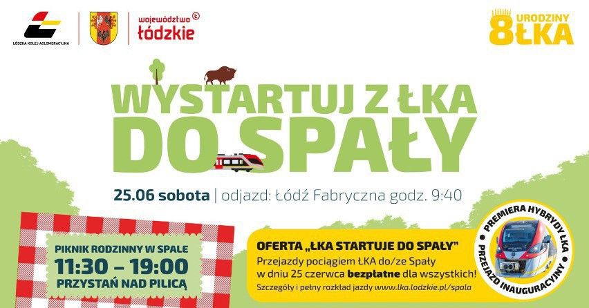 - Tego dnia uruchomimy wyjątkowo trzy pary połączeń i przejazdy będą nieodpłatne. Bilety już są dostępne w kasach, sklepach internetowych, a w dni przejazdu będą również u obsługi pociągu. 25 czerwca na przystani nad Pilicą w Spale odbędzie się piknik (od 11.30 do 19.00) z wieloma atrakcjami, zorganizowany przez ŁKA i samorządy - zapowiada Joanna Osińska, rzeczniczka prasowa Łódzkiej Kolei Aglomeracyjnej.