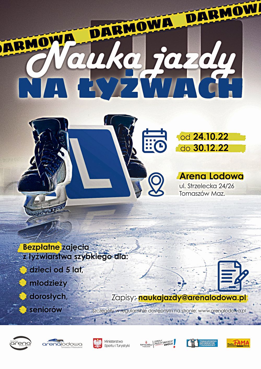Ruszają zapisy na zajęcia bezpłatnej nauki jazdy na łyżwach. Projekt ten realizuje Arena Lodowa - potrwa od 24 października do 30 grudnia 2022 r. (od poniedziałku do piątku w godzinach od 18.00 do 19.00).