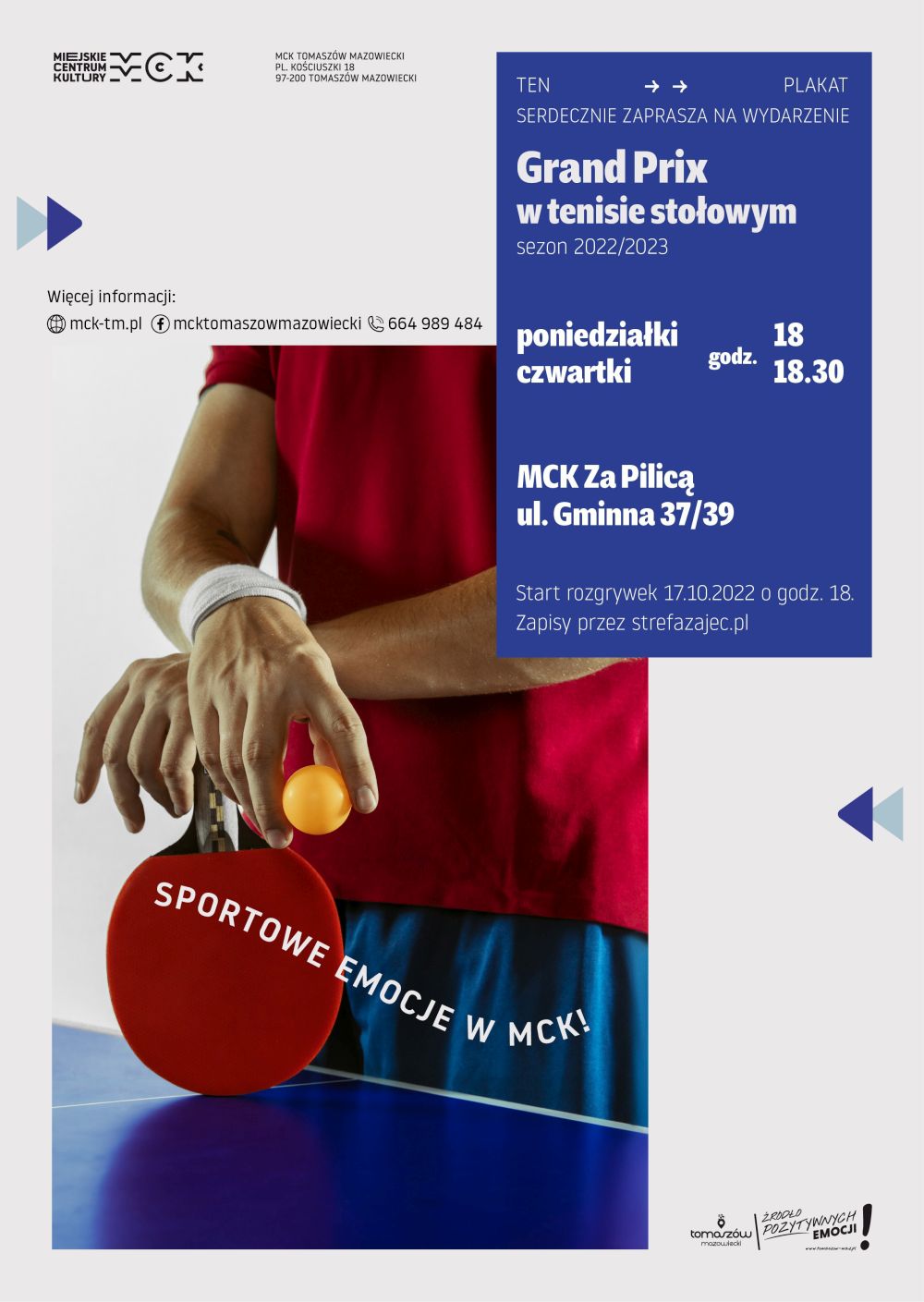 Miejskie Centrum Kultury w Tomaszowie Mazowieckim i Zarząd Miejski TKKF zapraszają na Grand Prix w tenisie stołowym sezon 2022/2023. Wszystkie mecze będą odbywały się w poniedziałki od godziny 18 i czwartki od godziny 18.30 w Miejskim Centrum Kultury Za Pilicą przy ul. Gminnej 37/39.