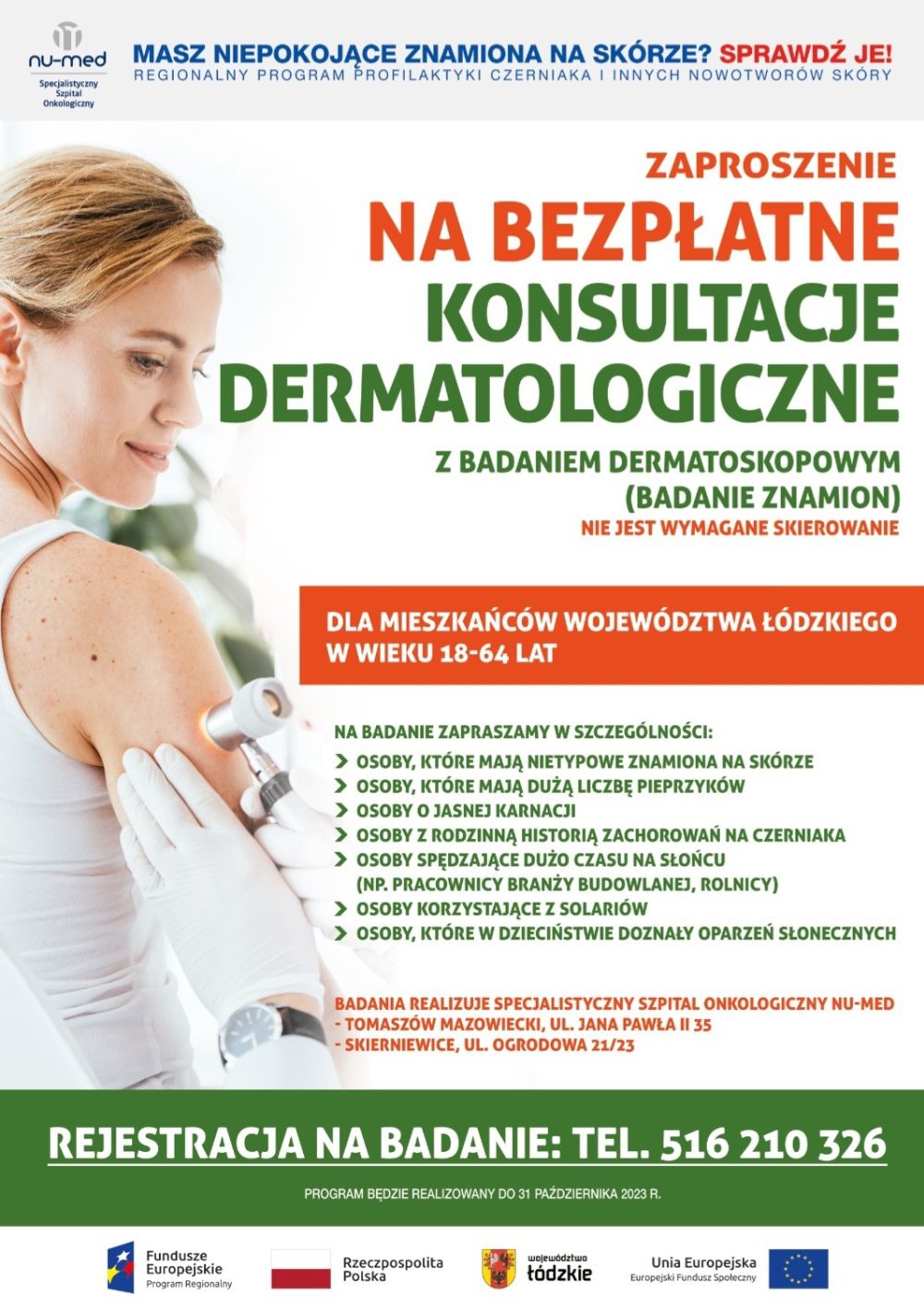 Realizowany przez Nu-Med projekt potrwa do 31 października 2023 r. W jego ramach przeprowadzone będą też: kurs dermatoskopowy dla lekarzy POZ oraz szkolenia z zakresu profilaktyki nowotworów skóry dla pracowników branży urodowej i rehabilitantów. Szczegółowe informacje będą aktualizowane na stronie internetowej: www.nu-med.pl. Uzyskać je można także pod numerami tel.: 516-210-326 lub 44 786-81-49.
