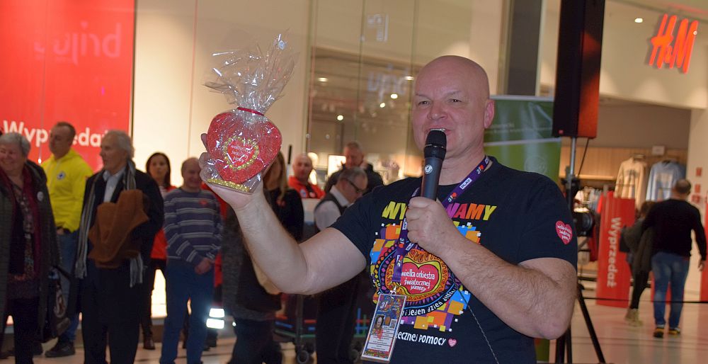 Po galerii chodzili wolontariusze z puszkami, wśród których, jak co roku, nie zabrakło m.in. członków Tomaszowskiego Uniwersytetu Trzeciego Wieku z prezeską Krystyną Wilk na czele. Bogdan Smolarek prowadził licytacje przedmiotów wystawionych na aukcje WOŚP. Ozdobne serce dla Krystyny Wilk wylicytował radny Adrian Witczak, a ta przekazała je niepełnosprawnej Marysi Wojciechowskiej. Radości z upominku było dużo.