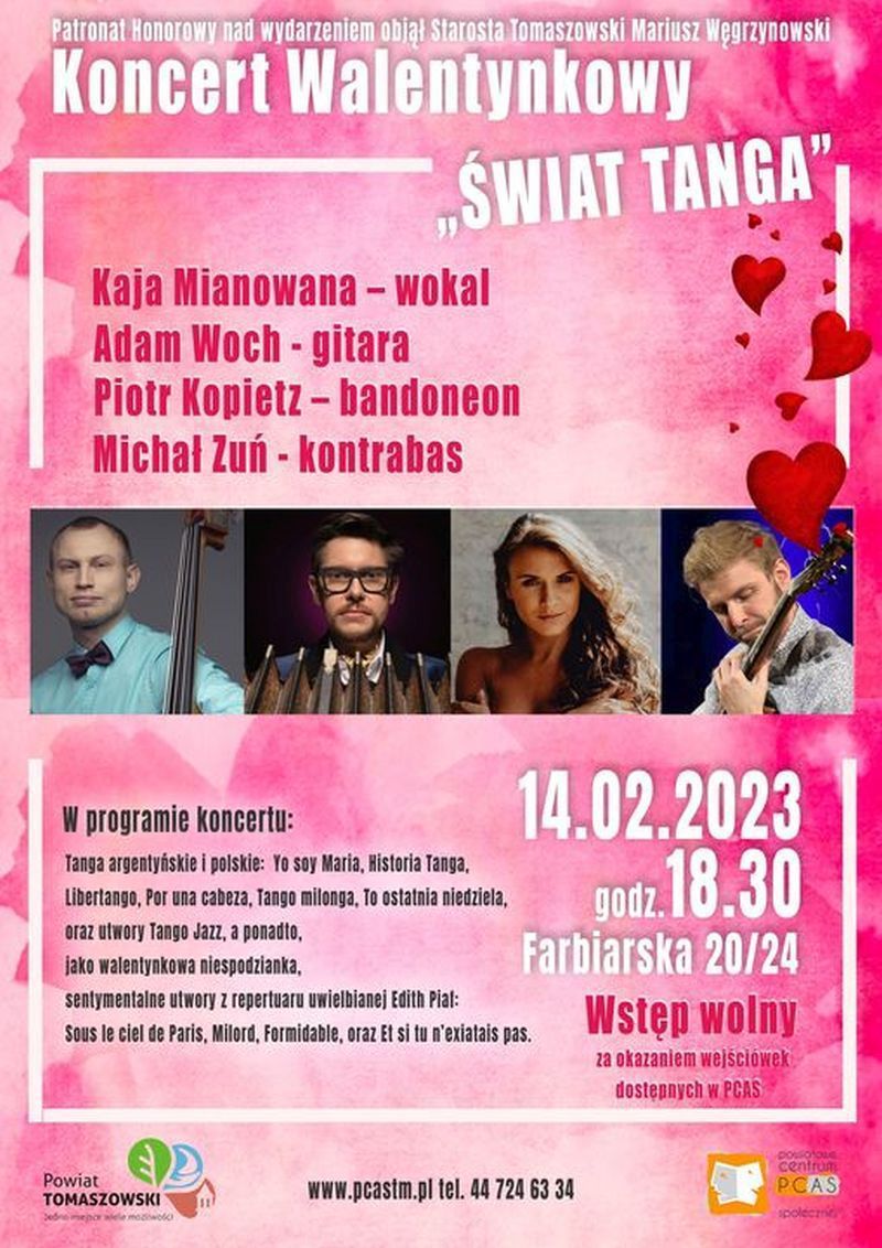 Walentynkowy wieczór będzie można spędzić w Powiatowym Centrum Animacji Społecznej na koncercie zespołu "Sentido" pt. "Świat tanga", który odbędzie się 14 lutego o godz. 18.30.