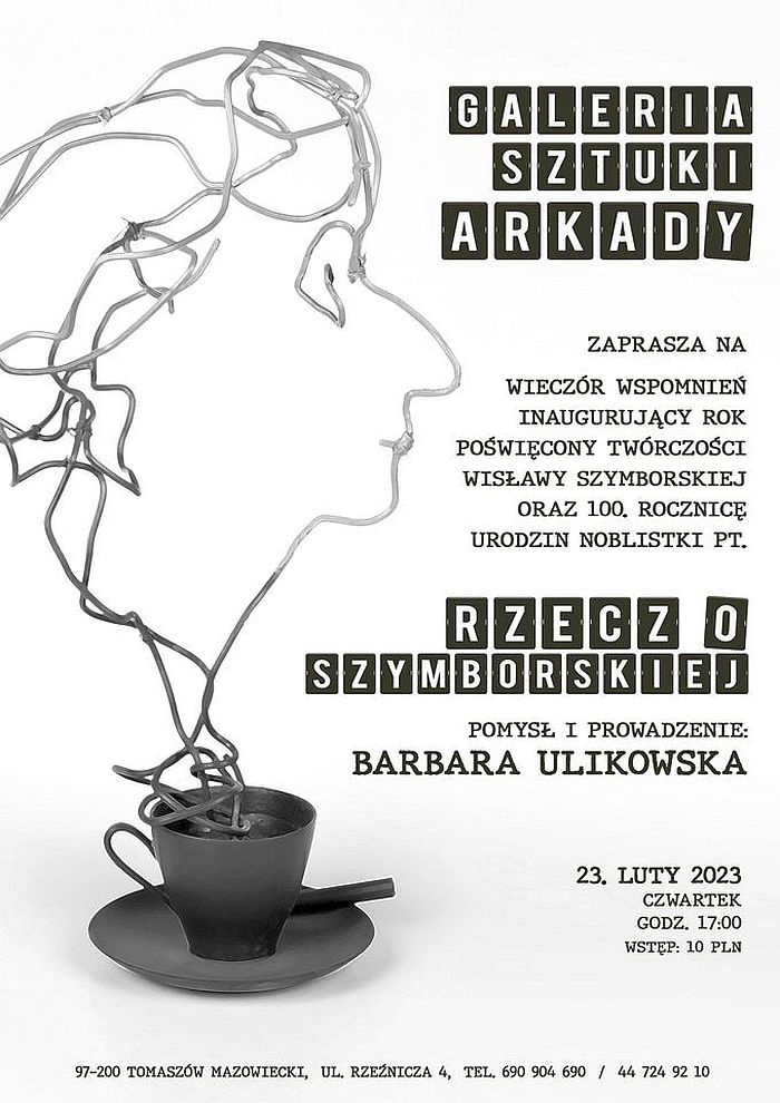 Galeria Sztuki Arkady informuje, że inauguruje (ale bez patosu) rok poświęcony twórczości Wisławy Szymborskiej. Wcześniej uczynił to Senat RP, ogłaszając rok 2023 rokiem noblistki. Jest to jednocześnie 100. rocznica urodzin poetki.