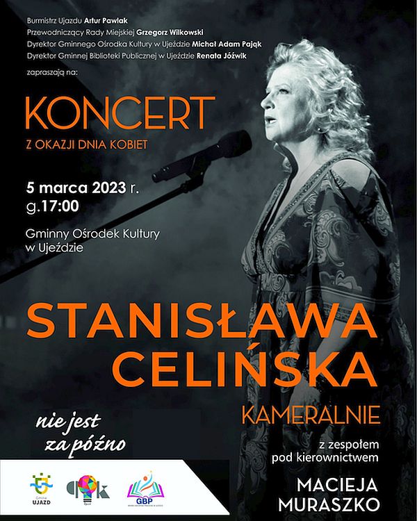 Stanisława Celińska "Kameralnie" z zespołem pod kierownictwem Macieja Muraszko wystąpi w niedzielę, 5 marca w Gminnym Ośrodku Kultury w Ujeździe. Koncert rozpocznie się o godz. 17.00.