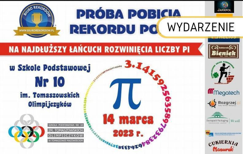 Aktualny (mamy nadzieję, że już niedługo) rekord na najdłuższy łańcuch rozwinięcia liczby Pi należy do uczniów Publicznej Szkoły Podstawowej w Osieku, ustanowiono go 14 marca 2019 r. Wyzwanie pobicia go podejmie społeczność Szkoły Podstawowej nr 10 wraz z zaproszonymi gośćmi pomiędzy godz. 10.30 a 12.00 na boisku wielofunkcyjnym placówki.