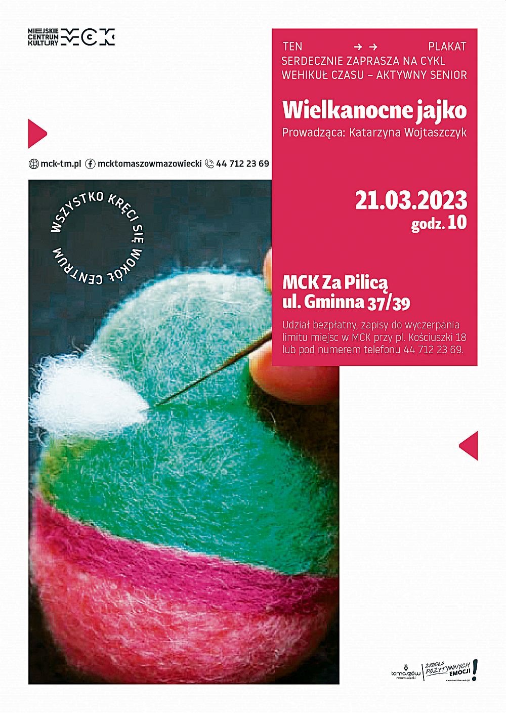 Udział w projekcie jest bezpłatny. Chęć udziału można zgłaszać w sekretariacie MCK przy pl. Kościuszki 18 lub telefonicznie pod numerem 44 712-23-69.