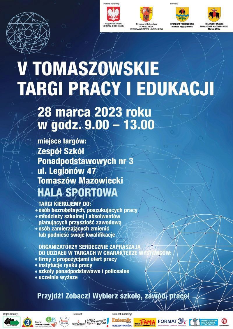 V Tomaszowskie Targi Pracy i Edukacji dla młodzieży, pracowników oraz wszystkich zainteresowanych kształceniem bądź rozwojem zawodowym odbędą się we wtorek, 28 marca w godz. 9-13 w ZSP nr 3.