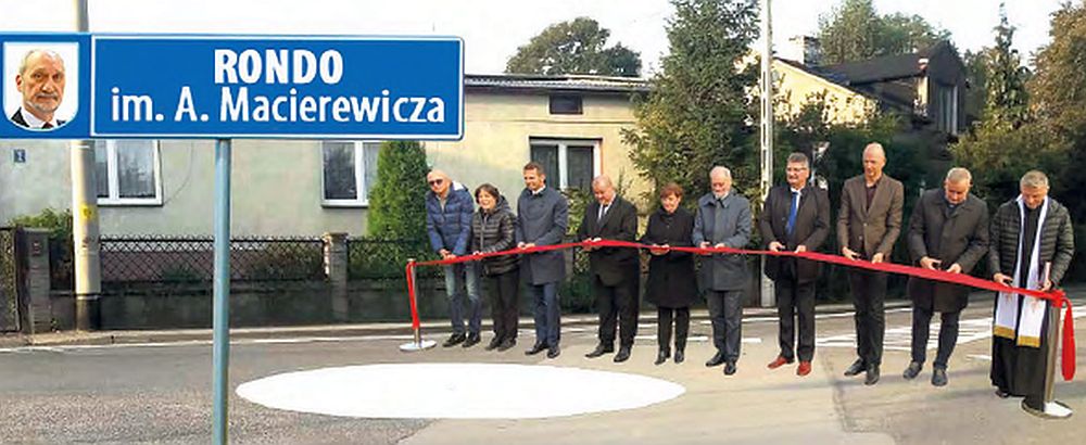 W obecności starosty, prominentnych urzędników, przedstawicieli biznesu i duchowieństwa odsłonięto znak C-12 „ruch okrężny”, a tablicę z pierwszą literą imienia i nazwiskiem umieszczono w centralnym punkcie pięknie odmalowanego koła. Możemy na niej przeczytać: Rondo im. A. Macierewicza. Skromny to, ale jakże wymowny dowód wdzięczności mieszkańców naszego pięknego miasta dla swojego, odwiecznego - chciałoby się rzec, przedstawiciela.