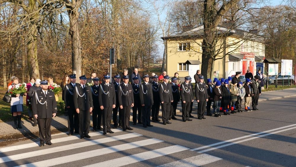 Rzeczyca-delegacja OSP składa kwiaty pod pomnikiem ofiar wojny