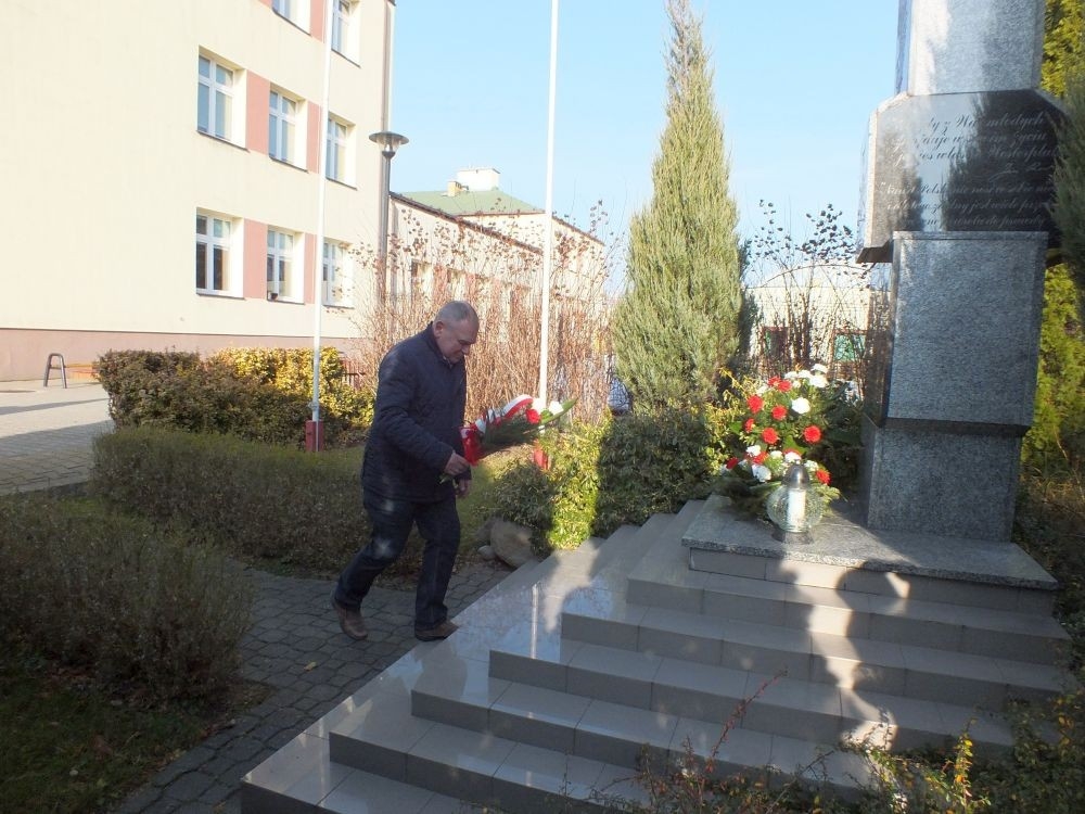 Ujazd-przedstawiciel seniorów z kwiatami przed pomnikiem Westerplatczyków