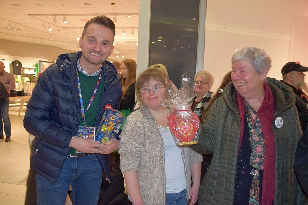 Krystyna Wilk, Marysia Wojciechowska i Adrian Witczak z wylicytowanym serduszkiem WOŚP