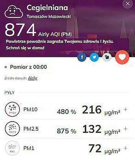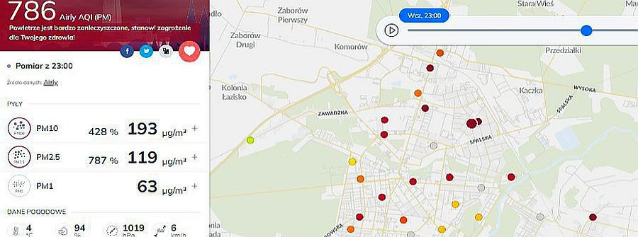 z zanieczyszczeniem pyłami zawieszonymi PM 10 na poziomie 110-120% i PM 2.5 do około 200% normy (aktualna dobowa WHO to odpowiednio 45 µg/m³ i 15 µg/m³).