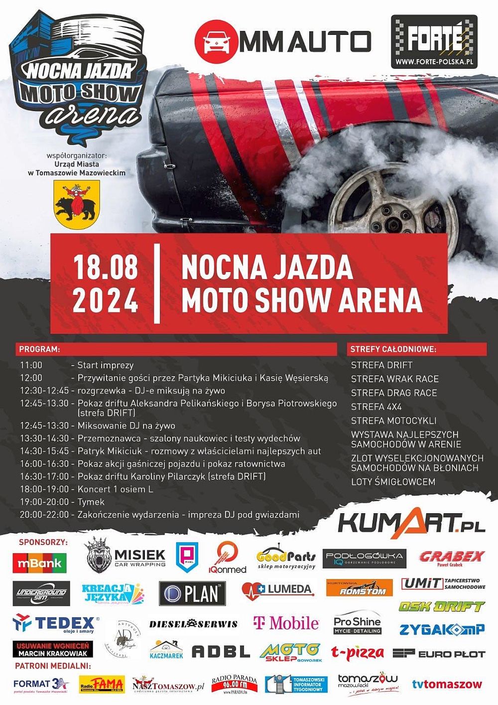 Wydarzenie odbędzie się na tomaszowskich błoniach oraz w Arenie Lodowej. Poprowadzą je Patryk Mikiciuk oraz Kasia Węsierska. O godz. 12.30 na scenie głównej odbędzie się rozgrzewka z pokazem tańca, zaś w godz. 12.45–13.30 pokaz driftu Aleksandra Pelikańskiego i Borysa Piotrowskiego (strefa DRIFT Mmauto). W tym czasie można będzie posłuchać miksowania DJ na żywo. Na godz. 13.30–14.30 organizatorzy zaplanowali pokaz Przemoznawcy (szalony naukowiec i testy wydechów).