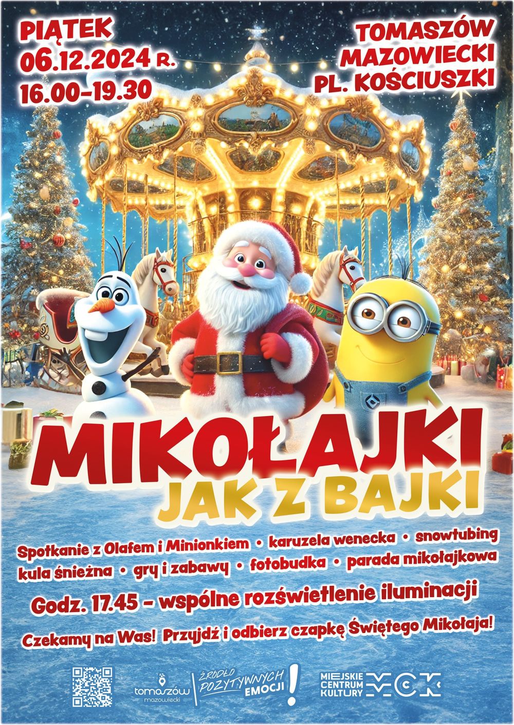 Mikołajki na placu Kościuszki stały się już tradycją. Odbędą się w piątek, 6 grudnia od godz. 16.00. Na miejscu można odebrać czapkę mikołaja dla siebie i wziąć udział w paradzie mikołajkowej. Dużo zabawy zapewni spotkanie z Olafem i Minionkiem, jak również korzystanie z fotobudki czy zabaw z Miejskim Centrum Kultury. Na placu Kościuszki, tak jak już od kilku lat, stanie też sztuczny stok, na którym można będzie zjeżdżać. – W tym roku dostępny będzie zdecydowanie dłużej, bo do 15 grudnia – mówi Joanna Budny, rzeczniczka prasowa Urzędu Miasta. Stok i inne atrakcje będą darmowe. Będzie też można skorzystać z karuzeli weneckiej i kuli śnieżnej. O godz. 17.45 nastąpi odpalenie iluminacji, które choć kosztowały krocie, to faktycznie od grudnia 2022 r. w okresie świąteczno-noworocznym cieszą oko.
