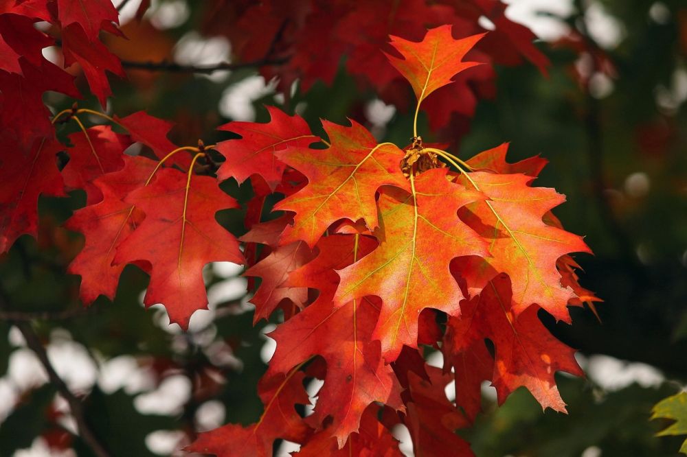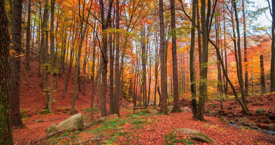 Jakby na przekór porze roku dopiero teraz w górach zakwita podobny do krokusa – nomen omen – zimowit jesienny, a na naszych terenach chroniony bluszcz pospolity. Rolę kwiatów w ubarwieniu jesieni przejmują w tym okresie drzewa liściaste mieniące się wręcz bajecznymi kolorami, przy czym zmiana barwy liści następuje stopniowo i różnych terminach. Daje to bogatą gamę odcieni żółci, czerwieni i brązu. Dodatkowym elementem kolorystycznym są czerwone owoce jarzębiny, cisu i dzikiej róży. Jest to jednak piękno ulotne. Wystarczy kilka większych przymrozków, by ta feeria barw zniknęła, a ostały się tylko nagie konary drzew.