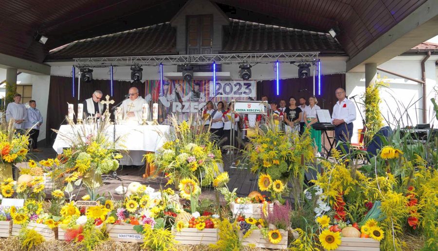 Dla rolników były to chwile pełne radości i dumy z dobrze wykonanej pracy, ale też czas odpoczynku i dobrej zabawy. Dożynki inaugurowała uroczysta msza święta, która zgodnie z planem rozpoczęła się o godzinie 12.00 i, co ciekawe, po raz pierwszy w historii była to msza polowa. Odprawiono ją na terenie Gminnego Ośrodka Kultury w Rzeczycy. Uroczyste kazanie wygłosił zaproszony przez proboszcza ojciec Andrzej Noga.