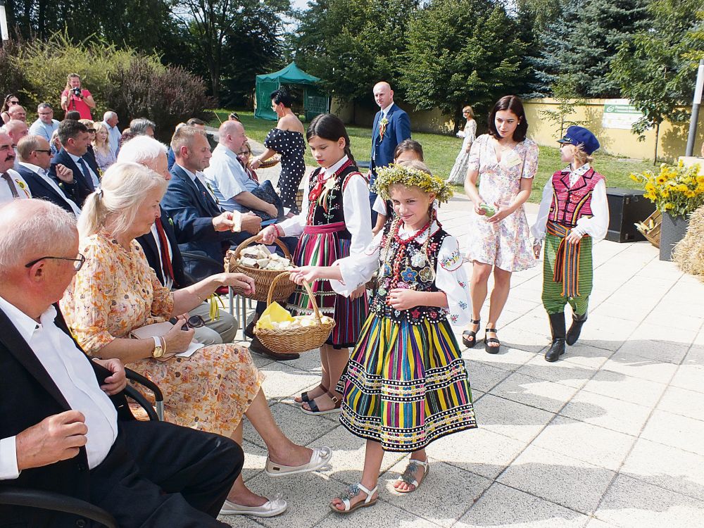W tym samym czasie Bogdan Kaczmarek ze starościną Ireną Cywińską, pokroili bochen na niewielkie kawałki, wsypując je do niewielkich podręcznych koszy. Z koszami na widownię amfiteatru pomaszerowały dzieci w malowniczych strojach ludowych, częstując uczestników imprezy tym najważniejszym pożywieniem.