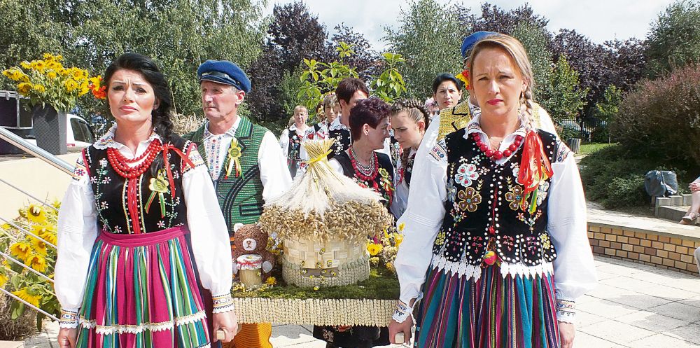 Przez estradę przewinął się również kolorowy korowód dożynkowy, obdarowując pierwszego gospodarza i przewodniczącą Rady Gminy wieńcem wykonanym w kształcie słomianego ula, pilnowanego przez niewielkiego pluszowego niedźwiadka. Zgodnie z miejscowym obyczajem panie i panowie z zespołu wokalnego "obtańczyli" wójta i przewodniczącą samorządu, w rytmach gorącego oberka.