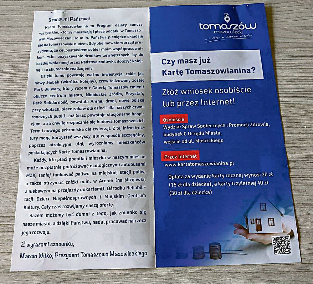Zdaniem naszego rozmówcy, ten poślizg nie jest dziełem przypadku. - Wskazuje na to zawartość koperty. Oprócz samej decyzji podatkowej każdy z mieszkańców dostaje ulotkę, w której magistrat zachęca do korzystania z Karty Tomaszowianina - wyjaśnia mężczyzna.