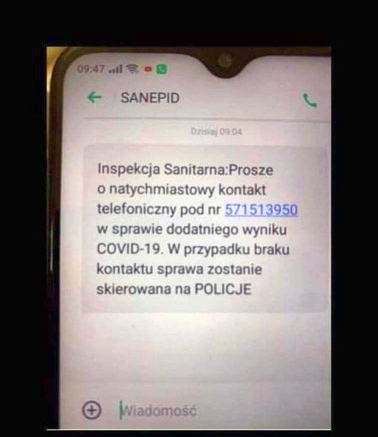 Słyszysz dźwięk w telefonie, to przyszedł SMS. Otwierasz, czytasz, a tam taka treść: Inspekcja sanitarna: proszę o natychmiastowy kontakt telefoniczny pod numer..., w sprawie dodatniego wyniku COVID-19. W przypadku braku kontaktu sprawa zostanie skierowana na policję". I co robisz? Spanikowany dzwonisz? A może myślisz: to niemożliwe, bo nie robiłem żadnego testu bądź też robiłeś i od tego momentu zaczynasz się bać i zastanawiać, co robić.