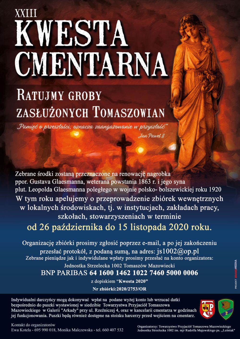 Już wiadomo, że ze względu na pandemię 1 listopada nie będzie kwesty przy bramach cmentarnych. Jedynie przy budynku kancelarii zostanie ustawiona jedna duża, przeszklona skarbonka. Harcerze z ZHP, sprzedający znicze, będą opiekowali się małymi puszkami na datki. Nie będzie za to skarbonek w starostwie i Urzędzie Miasta z uwagi na ograniczony dostęp petentów do tych urzędów. Będą puszki w biurze ogłoszeń TIT i w punkcie Informacji Turystycznej na pl. Kościuszki. Organizatorzy apelują do stowarzyszeń, takich jak Tomaszowski Uniwersytet Trzeciego Wieku i Stowarzyszenie Amatorów Plastyków oraz innych organizacji o zbiórkę datków we własnym zakresie i wpłatę bezpośrednio na konto: Paribas 64 1600 1462 1022 7460 5000 0006 z dopiskiem "kwesta cmentarna". Do wpłat będą zachęcały przygotowane na tę okazję specjalne plakaty.