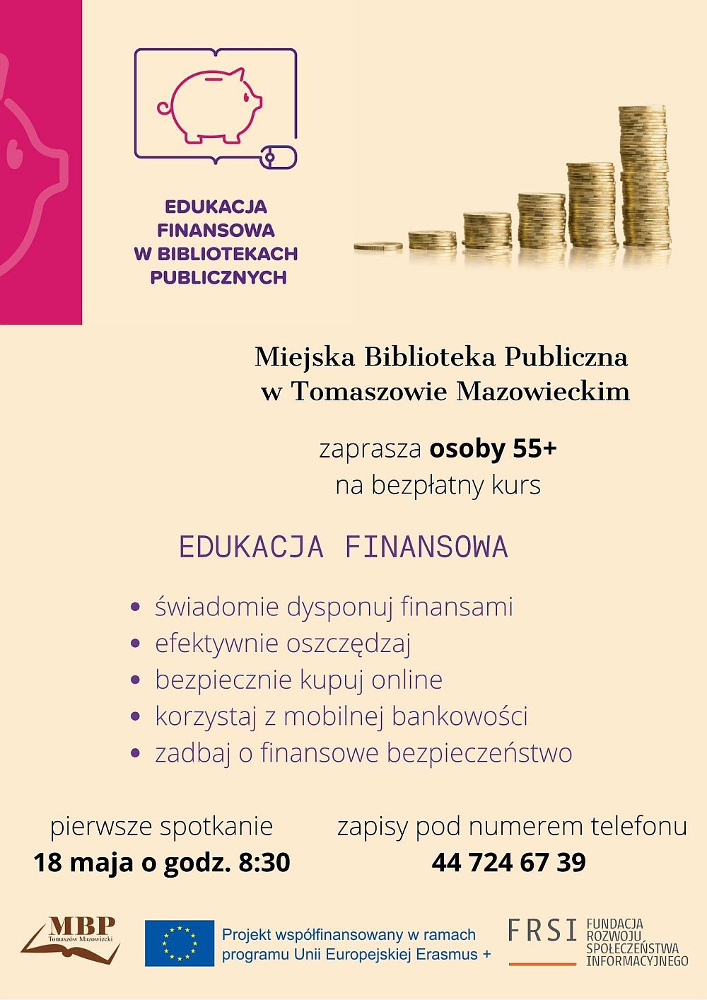 Bezpłatny kurs z edukacji finansowej proponuje Miejska Biblioteka Publiczna. Przystąpiła ona do projektu "Edukacja Finansowa w Bibliotekach Publicznych" współfinansowanego w ramach "Programu Unii Europejskiej Erasmus+", a w Polsce realizowanego przez Fundację Rozwoju Społeczeństwa Informacyjnego.